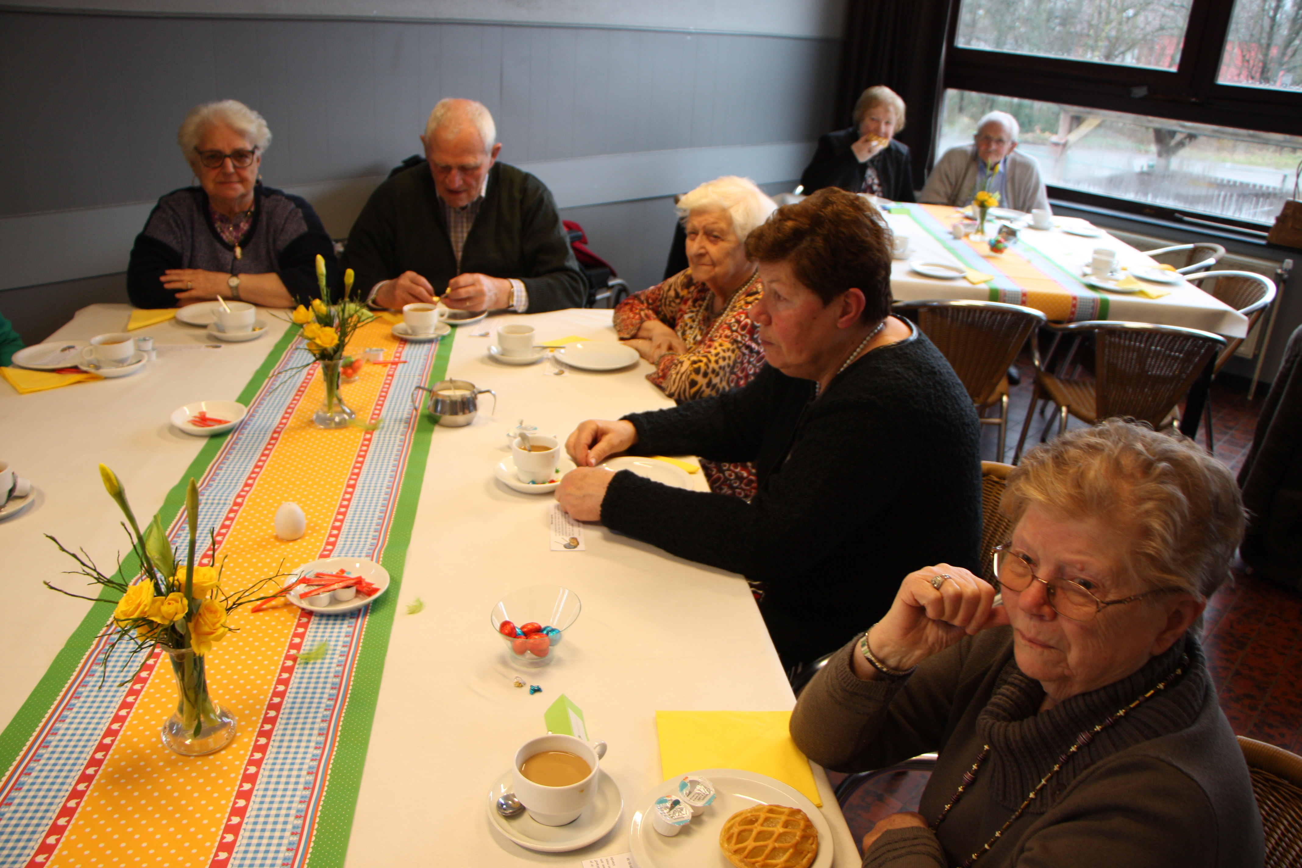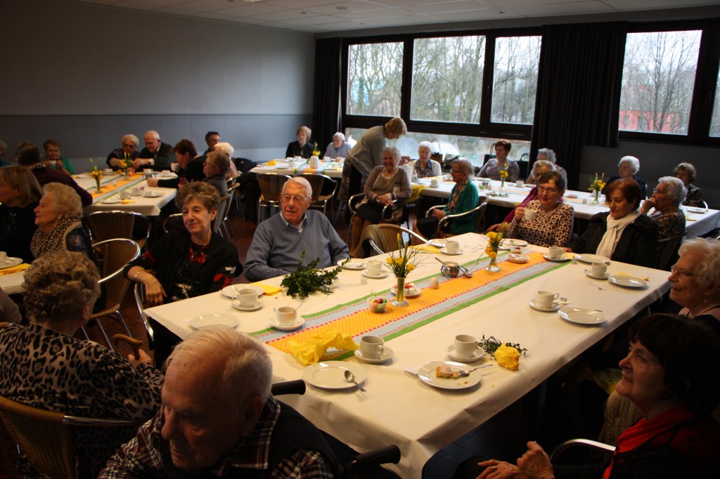 Na deze viering werd iedereen verwacht in het nabij gelegen parochiezaaltje ‘Ons Tehuis’. De zaal was feestelijk aangekleed. Alle gasten werden verwend met een kop koffie en een smakelijke rozijnenkoek. Er hing een duidelijk paassfeertje.