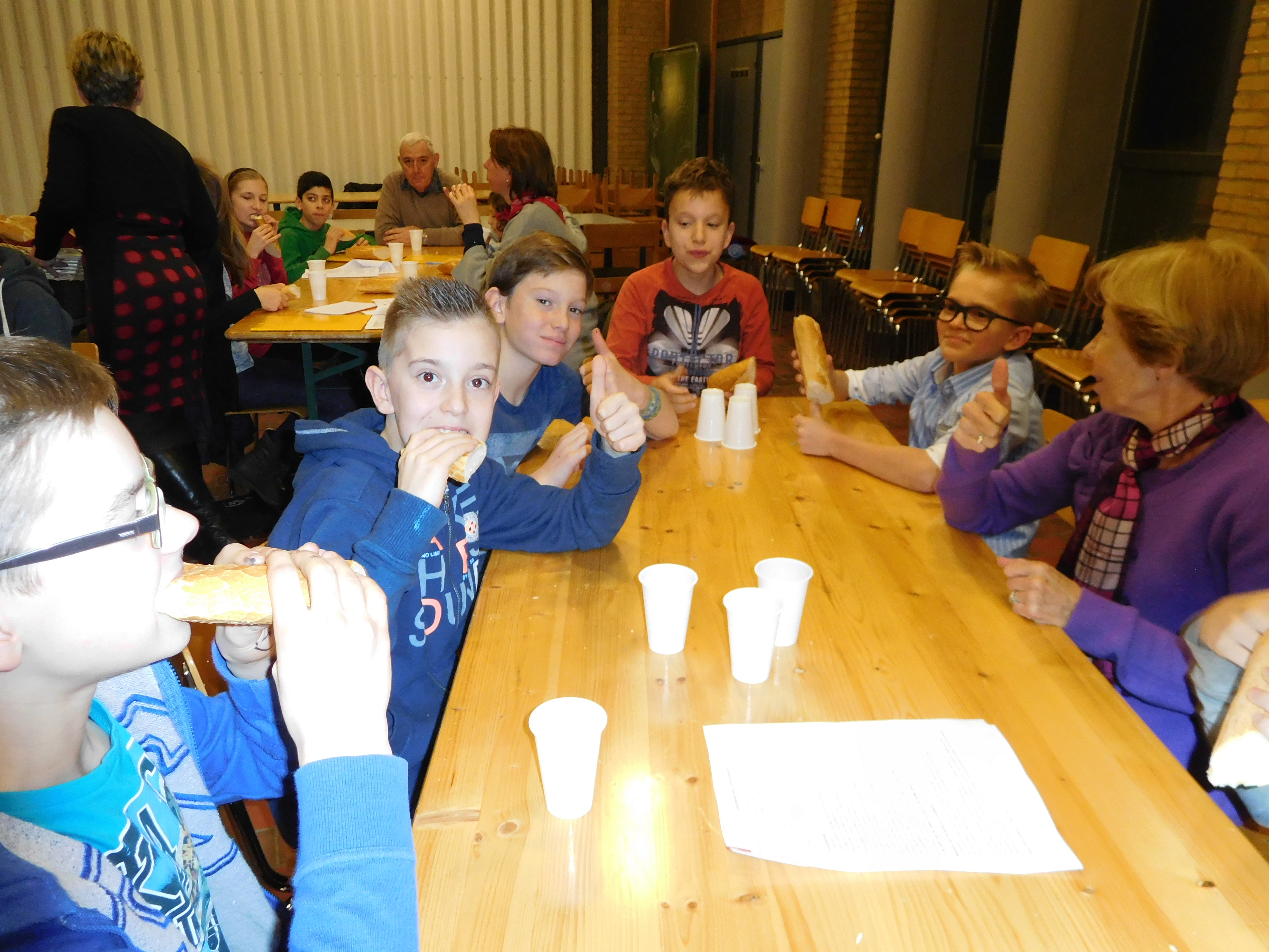Ter afsluiting van deze boeiende dag aten de vormelingen en hun begeleiders en dit in de geest van de vasten en om van hun solidariteit met het Colombiaanse volk te getuigen, een stuk droog brood en dronken ze gewoon water. Om 19.00 u was iedereen nog present tijdens de eucharistieviering.