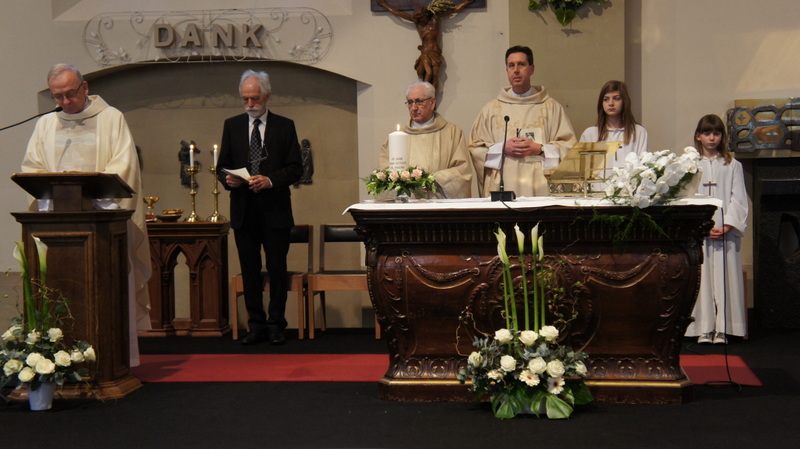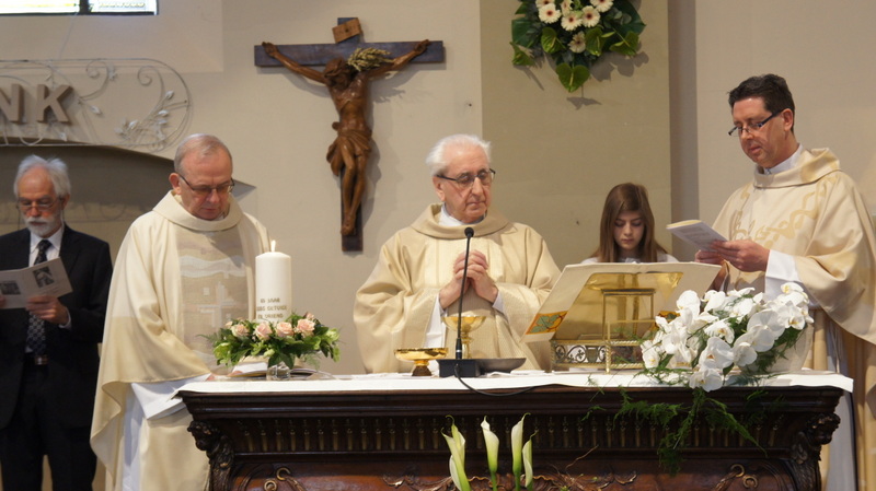 Precies om 11.00 u zette het Montfortkoor het intredelied in. Pastoor-deken Jaak Hermans heette iedereen welkom en nodigde de jubilaris, ere-pastoor Thijssen, uit, om voor te gaan in de viering. Doorheen deze viering stond het thema ‘dankbaarheid’ centraal. Dankbaar voor zovele jaren priesterschap, maar ook erkentelijkheid tegenover de grote groep parochianen die al die jaren pastoor Thijssen ‘gedragen’ hebben. Hij verwoordde deze gedachte meermaals tijdens de mooie viering.