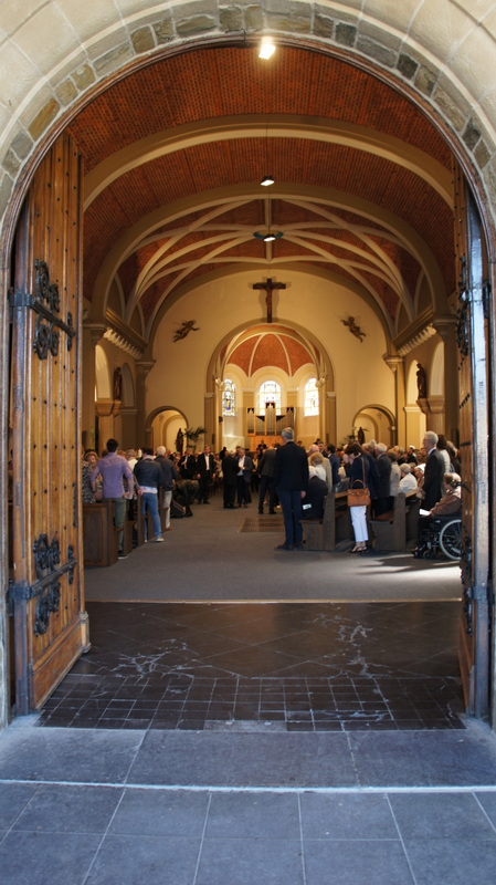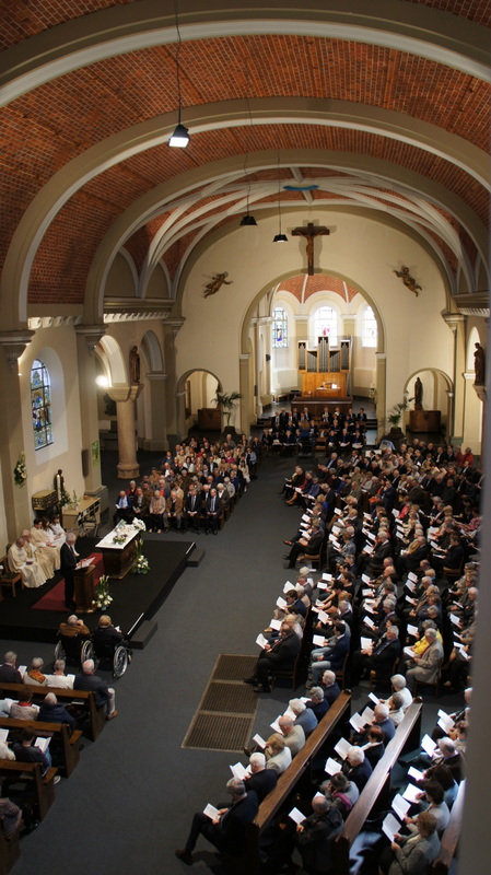 Het leek alsof de weergoden een afspraak hadden met de jubilaris. Na die miezerige zaterdag was deze feestelijke dag een echte ‘zon’-dag. De dagen voordien werd de kerk grondig gepoetst en een karrevracht verse bloemen door deskundige handen omgetoverd in mooie bloemstukken. Alle genodigden en parochianen vulden al gauw onze H.-Hartkerk. Een stemmig geroezemoes vulde het kerkgebouw.