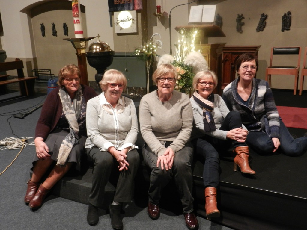 Ze zijn er elke week. Niet altijd met zovelen als op onderstaande foto, dat gebeurt voornamelijk bij liturgische feesten zoals kerstmis en Pasen, maar toch … ze steken zo dikwijls de handen uit de mouwen om dat tikkeltje meer te geven aan onze stemmige eucharistievieringen. Zij willen graag dat besef van Gods aanwezigheid verwoorden via bloemen. En daar slagen ze keer op keer in, met de grootste onderscheiding. In naam van alle kerkbezoekers … heel veel dank.