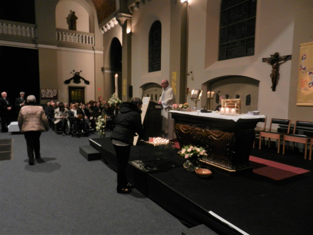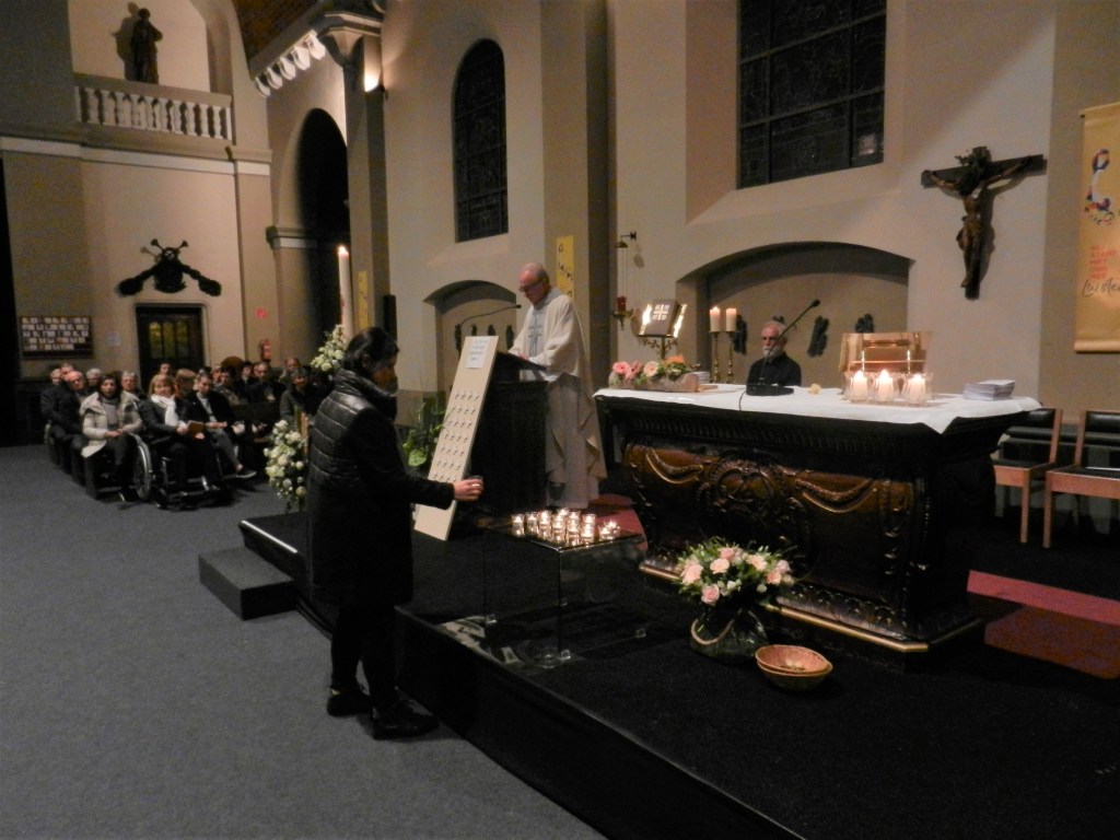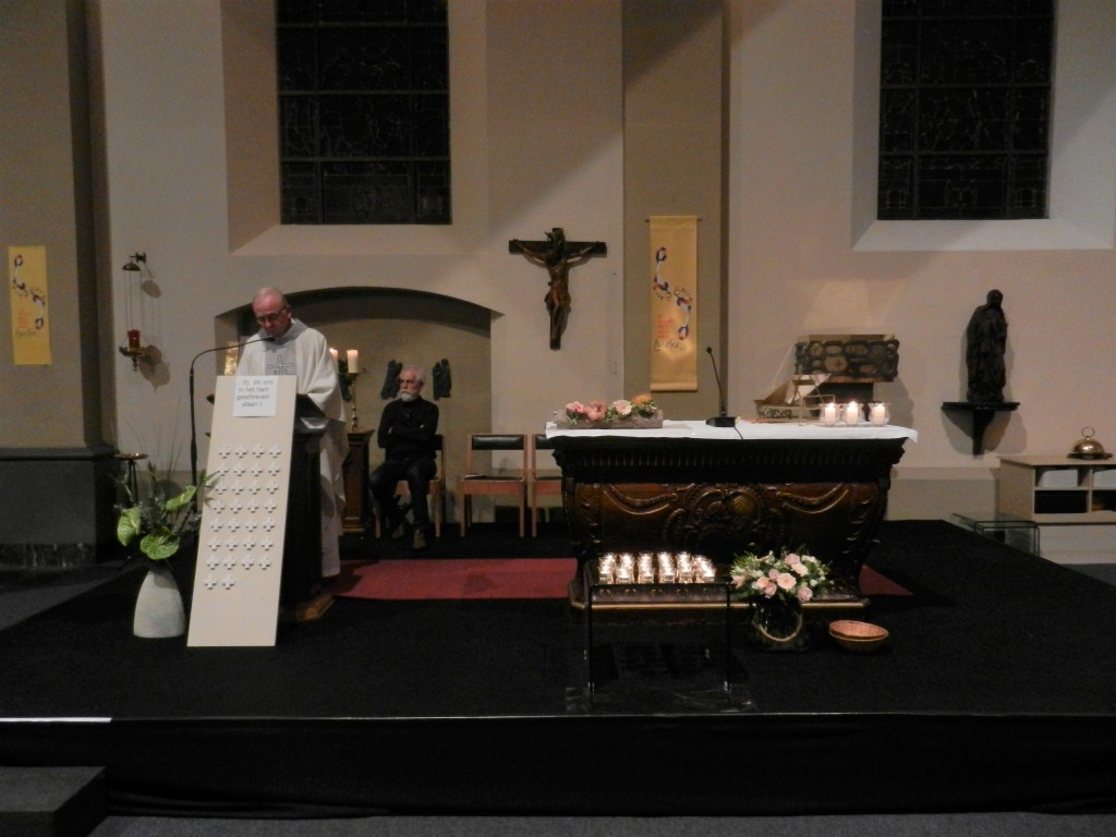 Alle namen van de overledenen van dit jaar (vanaf 3 nov 2017 tot nu) werden voorgelezen. Voor elk van hen brandde een kaarsje. Iemand van de familie – ze werden allen uitgenodigd – mocht dit kaarsje voor het altaar plaatsen, een symbool van hun blijvende (lichtende) aanwezigheid. Het is goed hen even terug levend in ons hoofd en onze herinneringen te brengen.