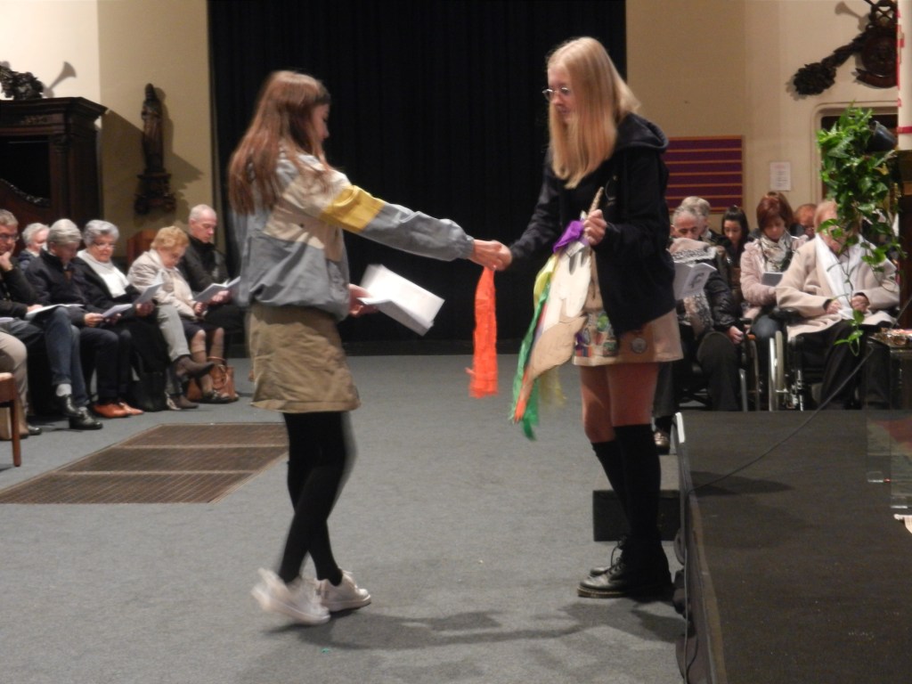 De stilte, zoals je in zovele kerken vindt, werd spontaan doorbroken door de laatste zenuwachtige afspraken, door kinderen die hun plaats zochten, door uitbundig gepraat … toch eigen aan onze kinderen, niet? Mattheüs schreef lang geleden: ‘Ik verzeker jullie, het hemelse koninkrijk kom je alleen binnen als je van gezindheid verandert en wordt als deze kinderen.’ Zijn als kinderen is toch blijven geloven in de goedheid, de toekomst, het leven en de mensen.