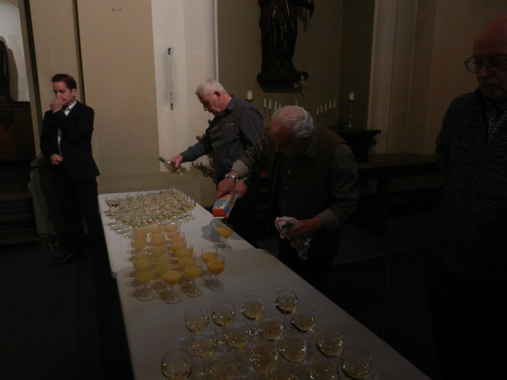 Het is 6 januari en we zijn met ons allen hopelijk gezond en wel het nieuwe jaar in getuimeld. Dat betekent ook dat de parochieraad de nieuwjaarsreceptie op haar agenda had staan. Enkele mensen werden, ook nu weer, bereid gevonden om een hele rist toastjes klaar te maken, de wijn te koelen en glazen te schikken. Een dikke merci.