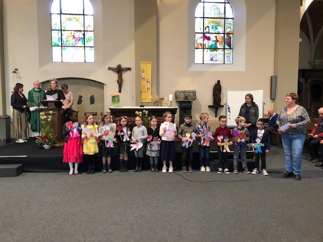 Alle aanwezigen zeggen daar volmondig ‘ja’ op, ‘jullie zijn meer dan welkom in onze geloofsgemeenschap.’ Ze knutselden ook mooie popjes die allen een hart vasthouden, en in dat hartje schreven ze al die mensen die zíj in hun hart dragen. Een mooi symbool. Wanneer ze op zo 19 mei 2019 hun eerste communie doen, nodigen zij op hun beurt ons allen uit op hun mooie feest in onze kerk.