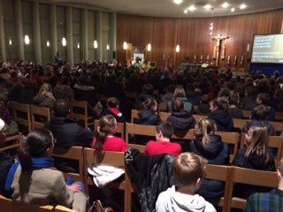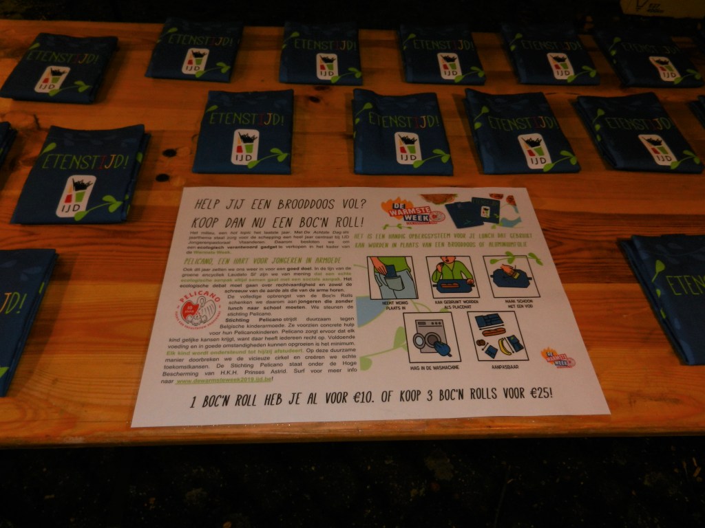 Rond de klok van 18.00 u werden de vele groepen uit alle windstreken van Limburg met open armen ontvangen. Meteen kregen ze een armband, een groene of blauwe. Het was eerst verzamelen geblazen op de parking voor de kerk, waar IJD een podium bouwde en alle jongeren trakteerden op een quiz over, hoe kan het ook anders, ons klimaat. Die quiz werd afgewisseld met het optreden van de vlaggenzwaaiers ‘Symbolica’ en een trommelkorps met enkele blazers. De stemming was opperbest bij het jonge volkje.