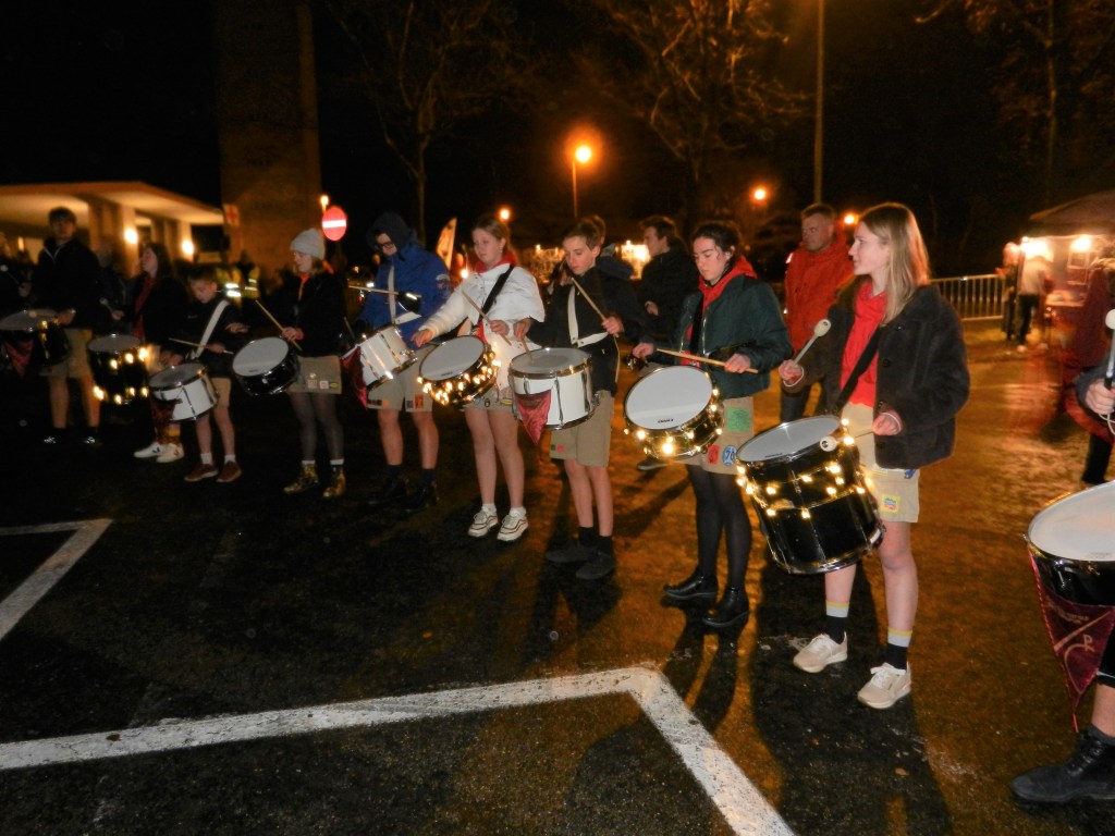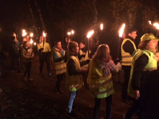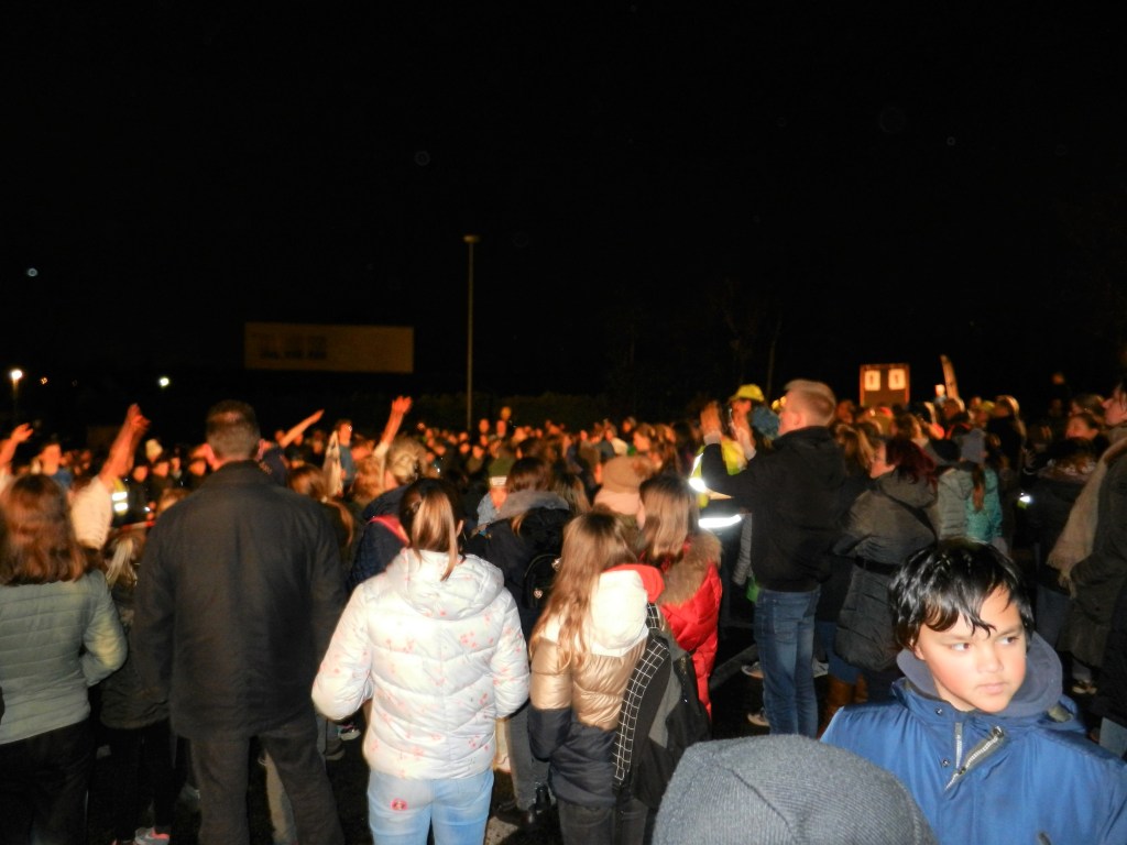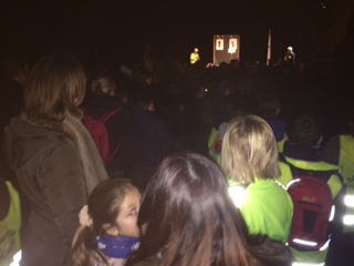 Vervolgens vertrok de ‘groene’ groep, met hun fakkels in de hand, voor hun tocht doorheen de straten van Boxbergheide. De ‘blauwe’ groep werd verwelkomd in de kerk, waar gebeden en gezongen werd. Na een klein uurtje wisselden de twee groepen van activiteit.