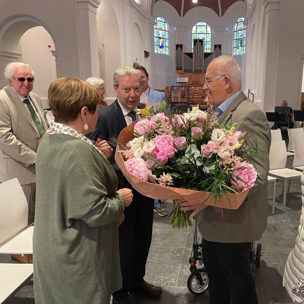 Vandaag was ook ‘t Fundament aanwezig in onze kerk om de misviering op te luisteren. Met een aangepast programma van liedjes van o.a. Charles E. Pratt en Nat King Cole mochten we het koppel in de bloemetjes zetten.