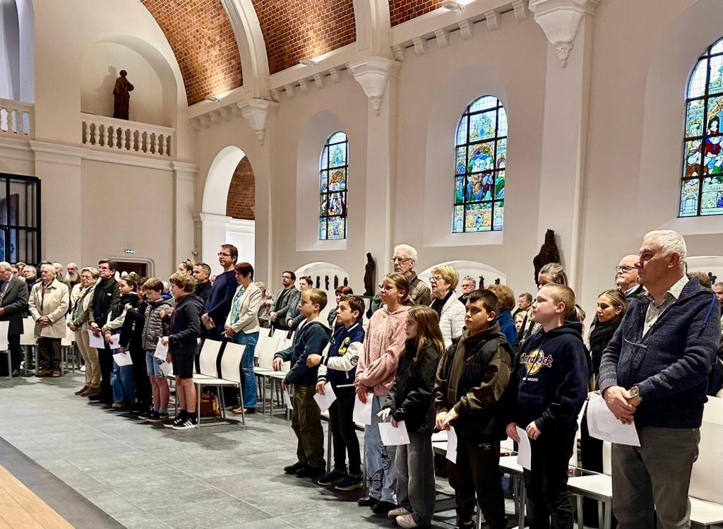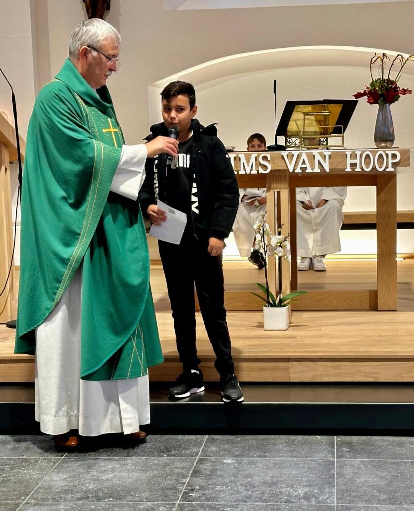Het was weer zover. Vandaag mochten alle jonge vormelingen weer even naar voren komen om hun naam op te geven voor het vormsel en ook hun intentie waarom ze dit willen doen. Een voor een kwamen ze aan bod, allen met veel enthousiasme en goede moed om aan dit traject te beginnen. Samen zullen ze een klein jaar samenzitten met enkele begeleiders om na te denken wat een leven samen met God kan betekenen voor hun.