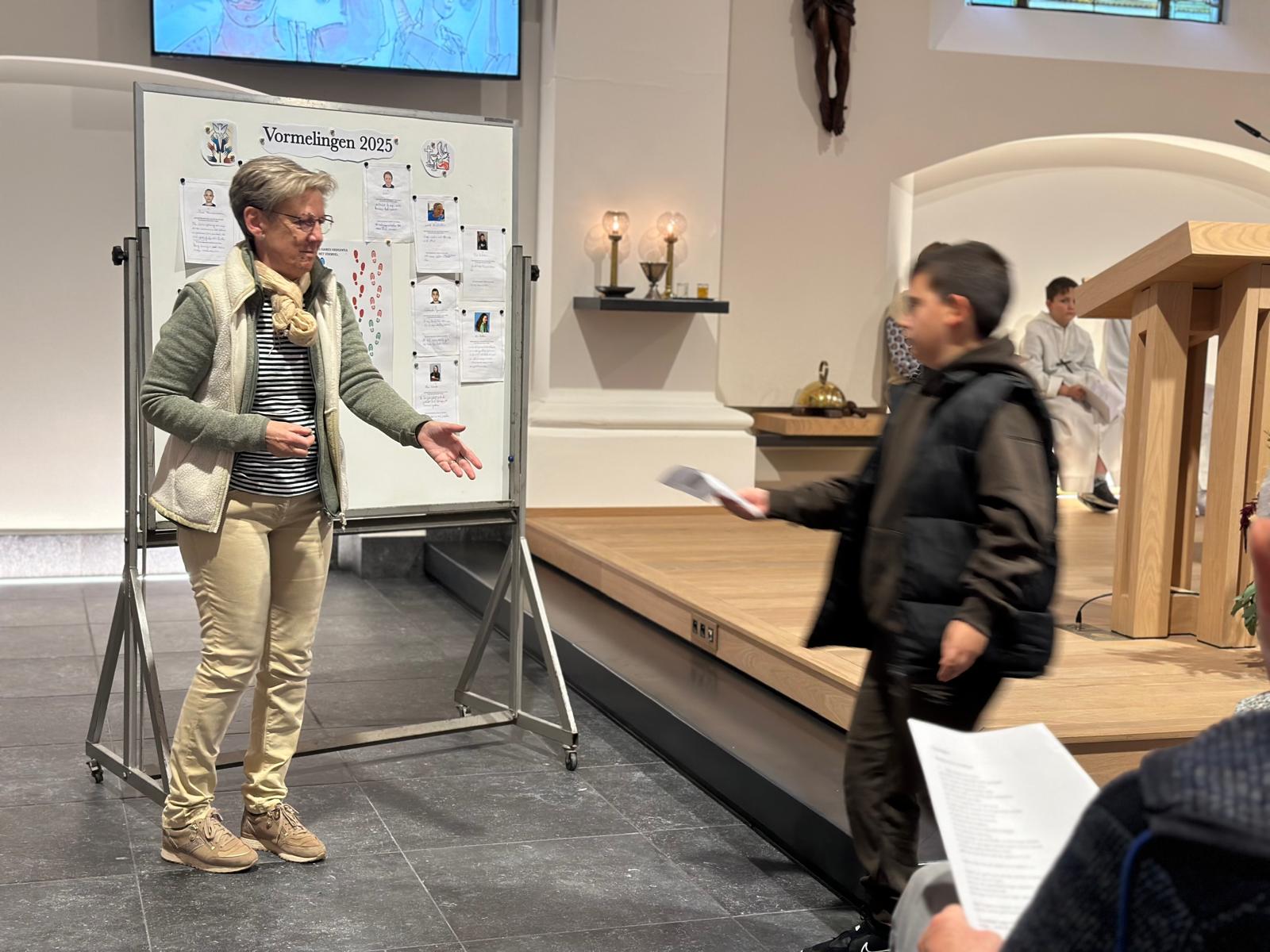 Het was weer zover. Vandaag mochten alle jonge vormelingen weer even naar voren komen om hun naam op te geven voor het vormsel en ook hun intentie waarom ze dit willen doen. Een voor een kwamen ze aan bod, allen met veel enthousiasme en goede moed om aan dit traject te beginnen. Samen zullen ze een klein jaar samenzitten met enkele begeleiders om na te denken wat een leven samen met God kan betekenen voor hun.