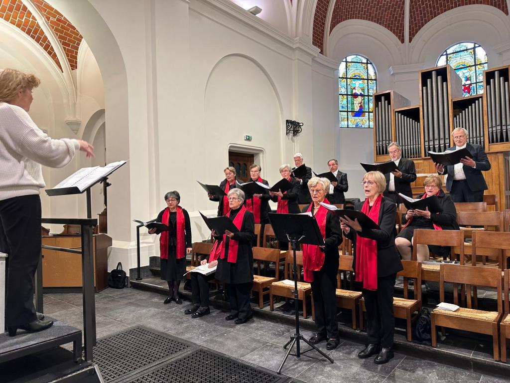 Gisteren werd de mis – zoals bijna altijd – opgeluisterd door het Montfortkoor. Toch waren ze wat beter uitgedost dan anders. Zowel de mooie rode accenten op hun klederdracht, maar ook de accenten in de muziek zelf mochten er zeker zijn.