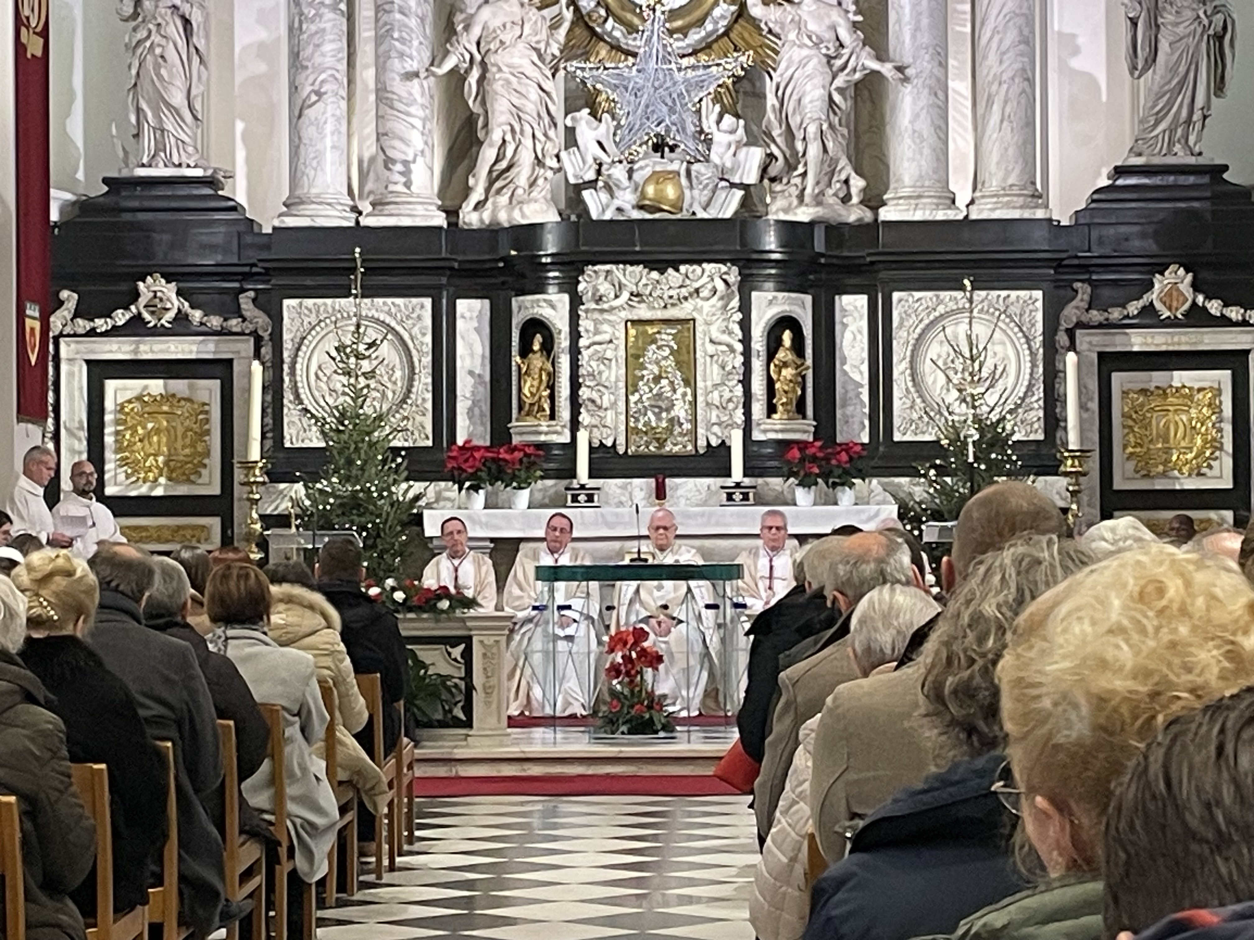 Eenmaal aangekomen, opent onze bisschop plechtig de deuren van de kathedraal. Net als de paus in Rome, klopt hij driemaal met de kruisstaf aan. De deuren openen en met de nodige wierook en gezangen treedt de menigte binnen. Zo ook de kerkbaljuw, uitgerust met hellebaard, die plechtig postvatte aan de rand van het altaar. Knap! De bisschop, bijgestaan door verschillende priesters, ging voor en samen mochten we een traditionele eucharistie vieren met de nodige pracht en praal.