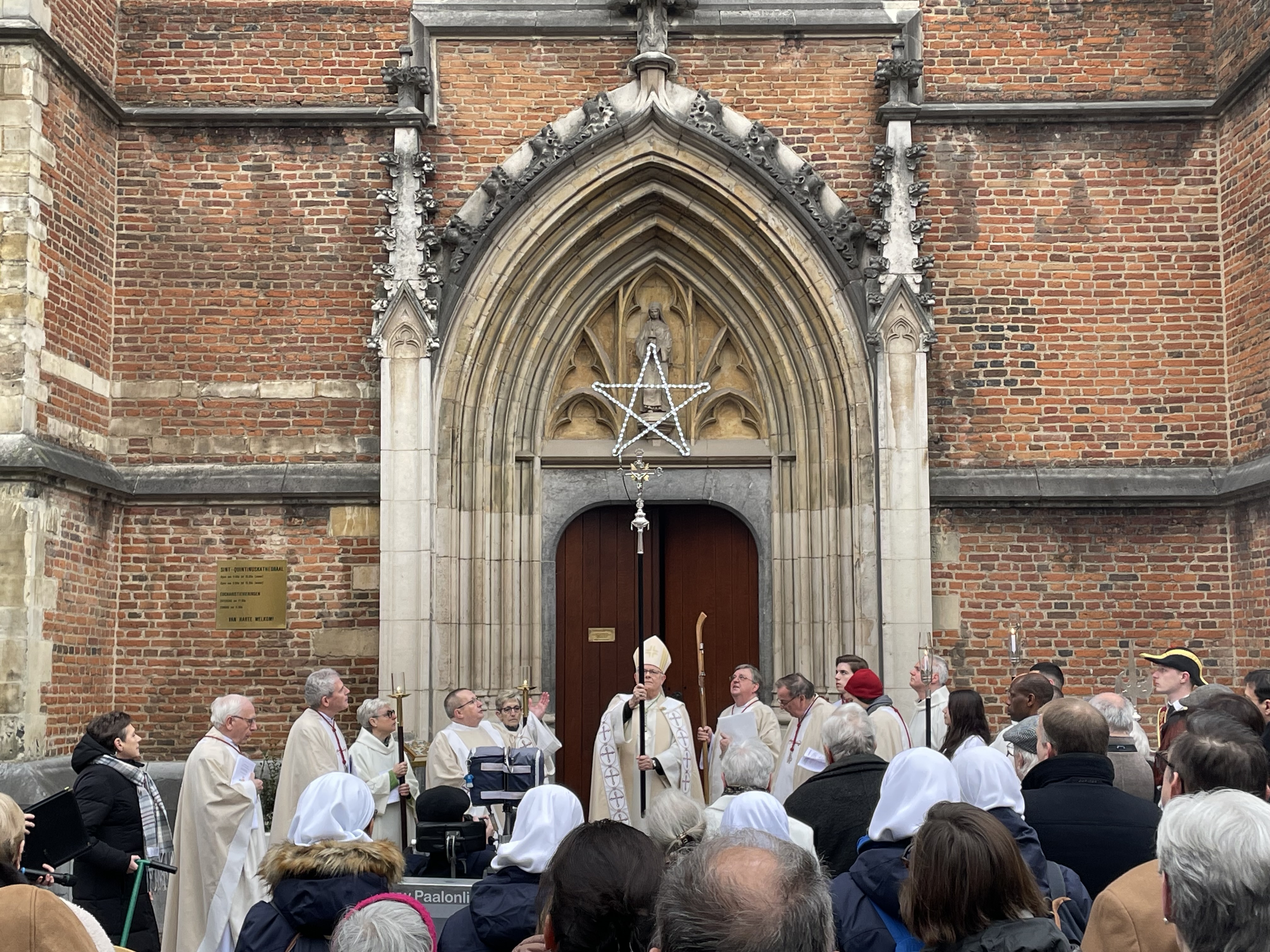 9u40, de deuren van de trein gaan zachtjes dicht en langzaam begint het landschap schijnbaar in beweging te komen. Een korte rit brengt ons naar Hasselt om er, onder leiding van de bisschop, het jubeljaar officieel te openen. Alles begint in de Virga Jesse Basiliek waar we een korte gebedsdienst bijwonen. Vervolgens stappen we in een korte pelgrimstocht naar de Sint-Quintinuskathedraal. Het jubeljaar spreekt immers over “Pelgrims van Hoop”. Met bisschop Patrick op kop stroomt een massa gelovigen door de Hasseltse straten, waar mensen nieuwsgierig postvatten.