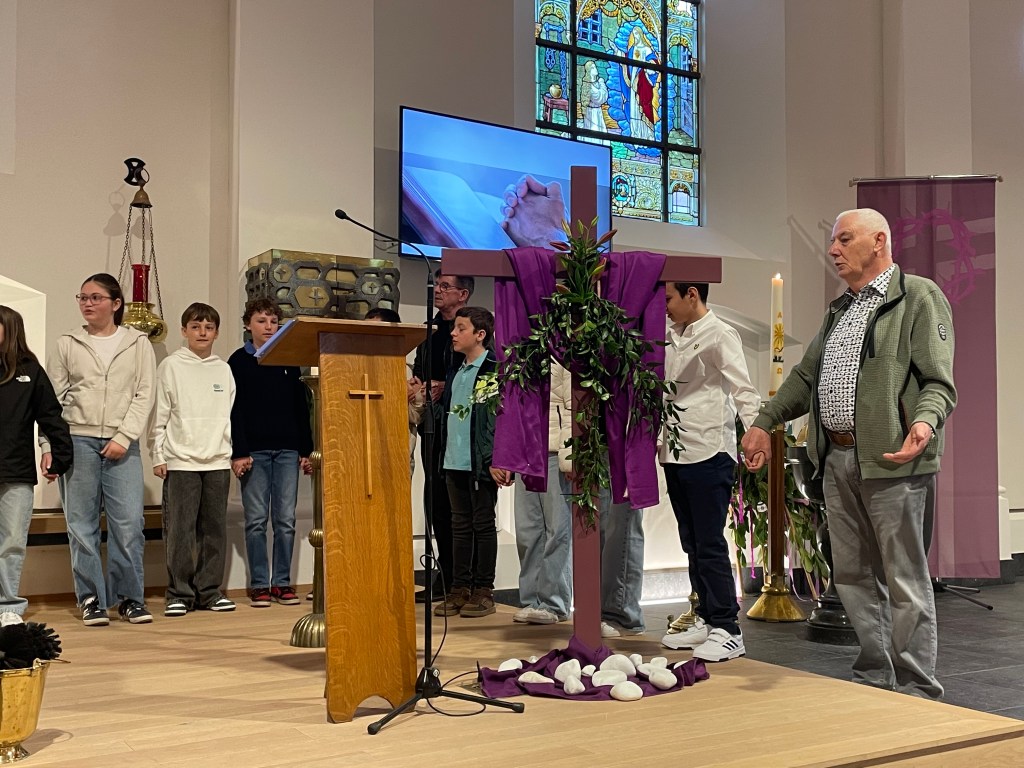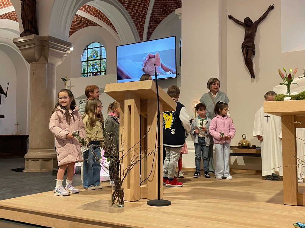 In deze viering, met een rijkelijk gevulde kerk, werden bij de aanvang de palmtakjes gezegend. Na een korte processie doorheen de kerk, uitgevoerd door een talrijke groep van communicanten en vormelingen, werden ze voor het altaar geplaatst. Wat volgde was een mooie vertelling van het lijdensverhaal, aangevuld met prachtige liederen van ons bijzonder Montfortkoor.