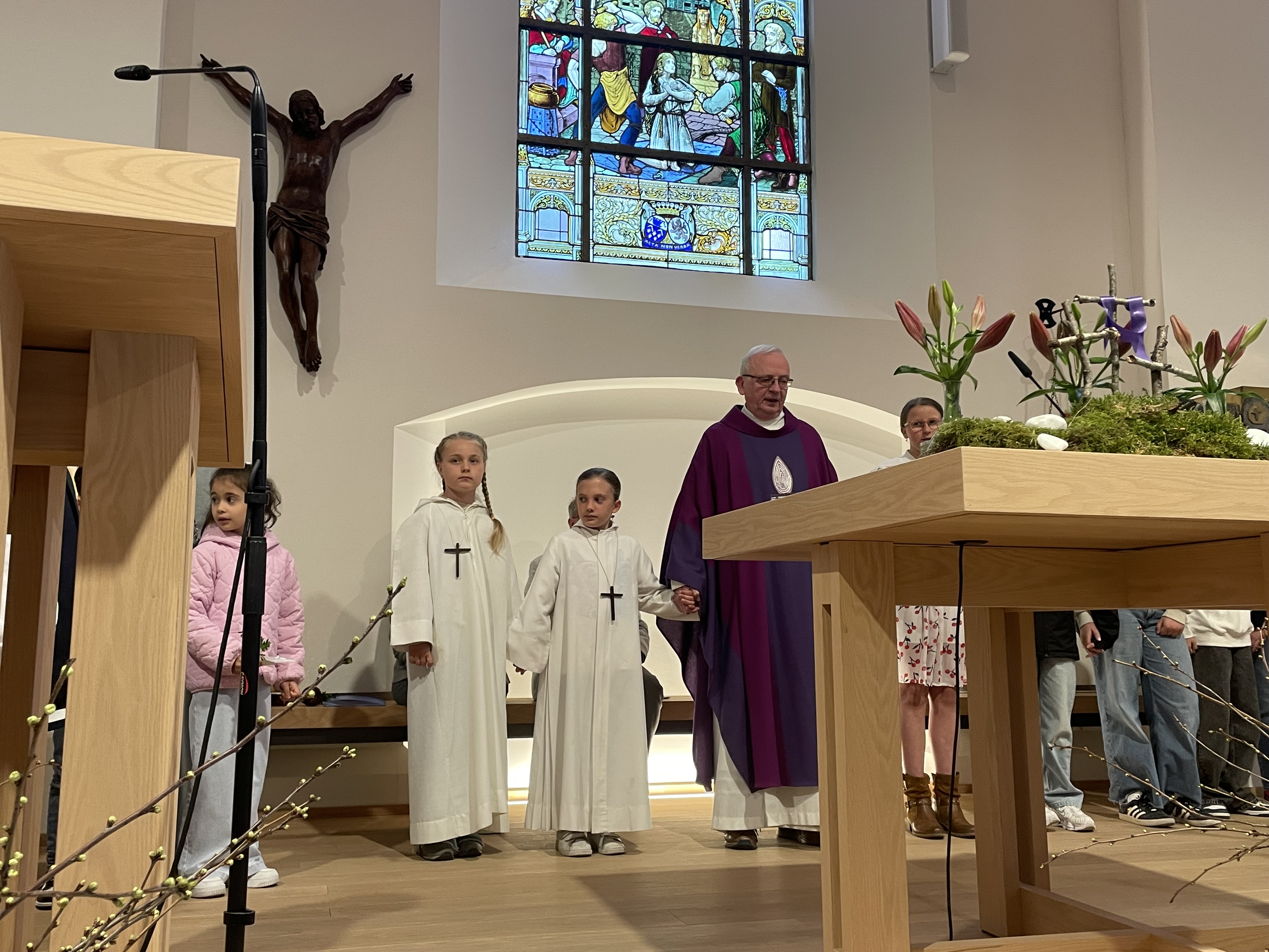 In deze viering, met een rijkelijk gevulde kerk, werden bij de aanvang de palmtakjes gezegend. Na een korte processie doorheen de kerk, uitgevoerd door een talrijke groep van communicanten en vormelingen, werden ze voor het altaar geplaatst. Wat volgde was een mooie vertelling van het lijdensverhaal, aangevuld met prachtige liederen van ons bijzonder Montfortkoor.